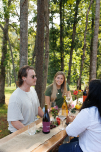 Our outdoor tasting room sits on a breathtaking overlook at the top of the property. Grab a glass of wine, a slice of woodfired pizza from Embers, or an order of empanadas, then find a seat on the lawn with views of the vineyard, pastures, and forest stretching out below you.